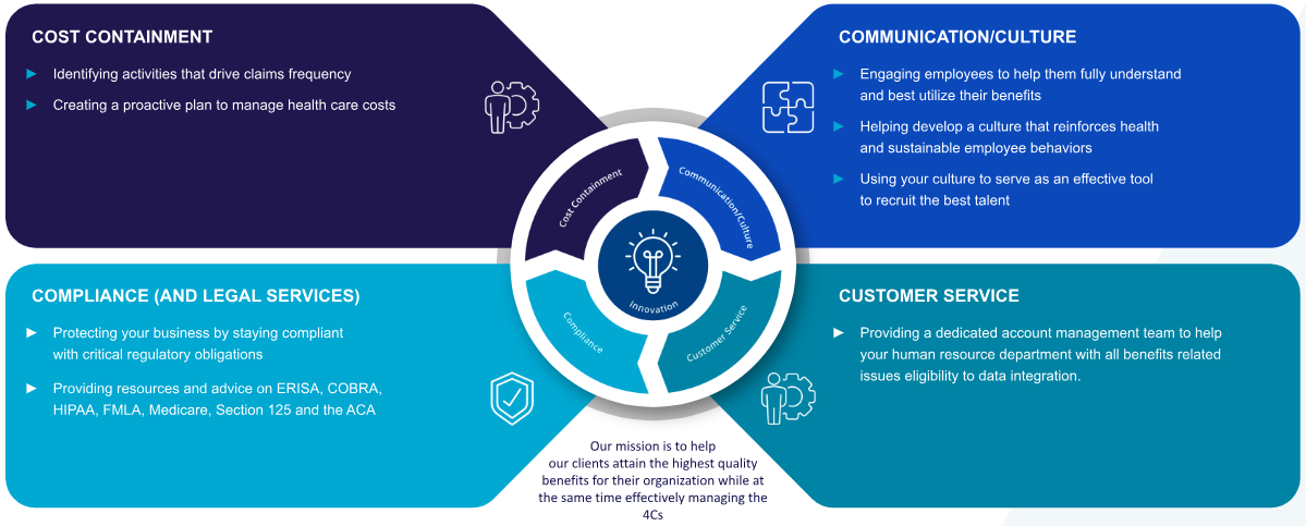 Our clients rely on us to help their organizations manage their benefits strategy holistically. The “4 C’s” framework at JM Brassill Group focuses on: