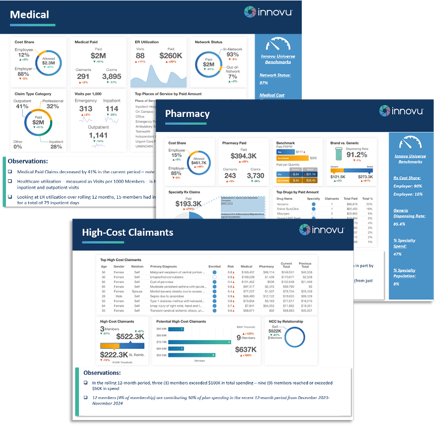 Innovu provides benchmarks for medical, pharmacy, plan design and employers fixed costs. Additional detail on each benchmark is captured below: